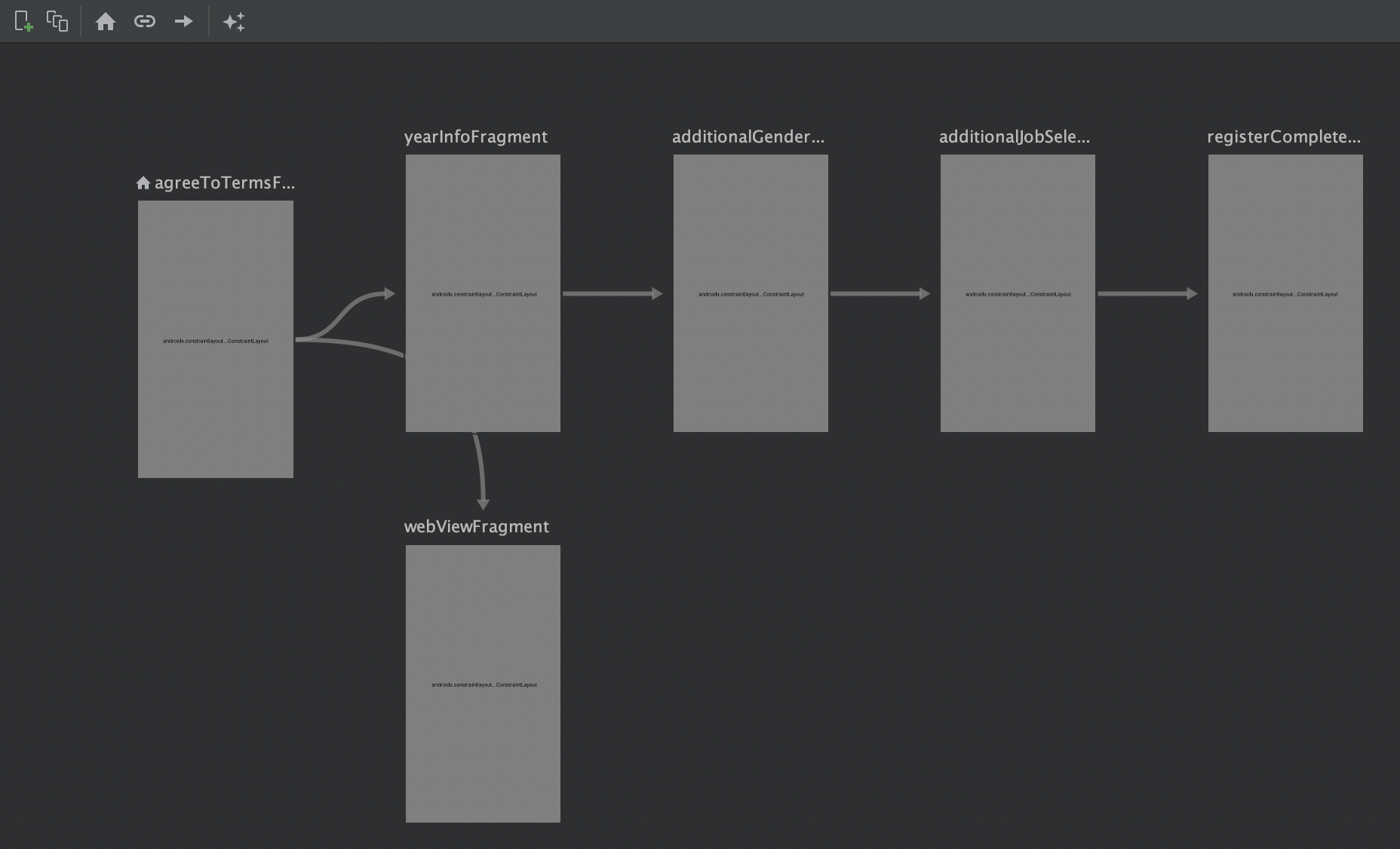 그래서 Jetpack에서는 버튼의 상호작용에 의한 화면의 이동부터 뒤로가기 등(또는 앱바와 같은 추가적인 기능)의 작업까지 모두 navigation 패키지 내의 그래프에서 처리 가능하도록 기능을 추가했습니다. 하나의 플로우는 하나의 그래프로 관리되며 이 그래프는 NavHost가 가지게 되며, 이를 NavController를 통해 관리할 수 있습니다. 이 그래프는 iOS의 스토리보드와 유사한 역할을 하고 있습니다.