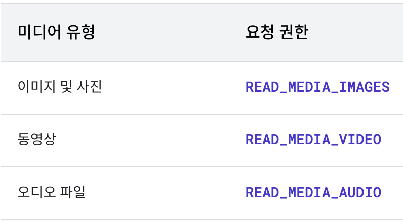 그 다음은 미디어 권한 세분화입니다. 원래는 READ_EXTERNAL_STORAGE 권한 하나면 충분했는데, 이를 3가지(READ_MEDIA_IMAGES, READ_MEDIA_VIDEO, READ_MEDIA_AUDIO)로 분리한다고 합니다.
