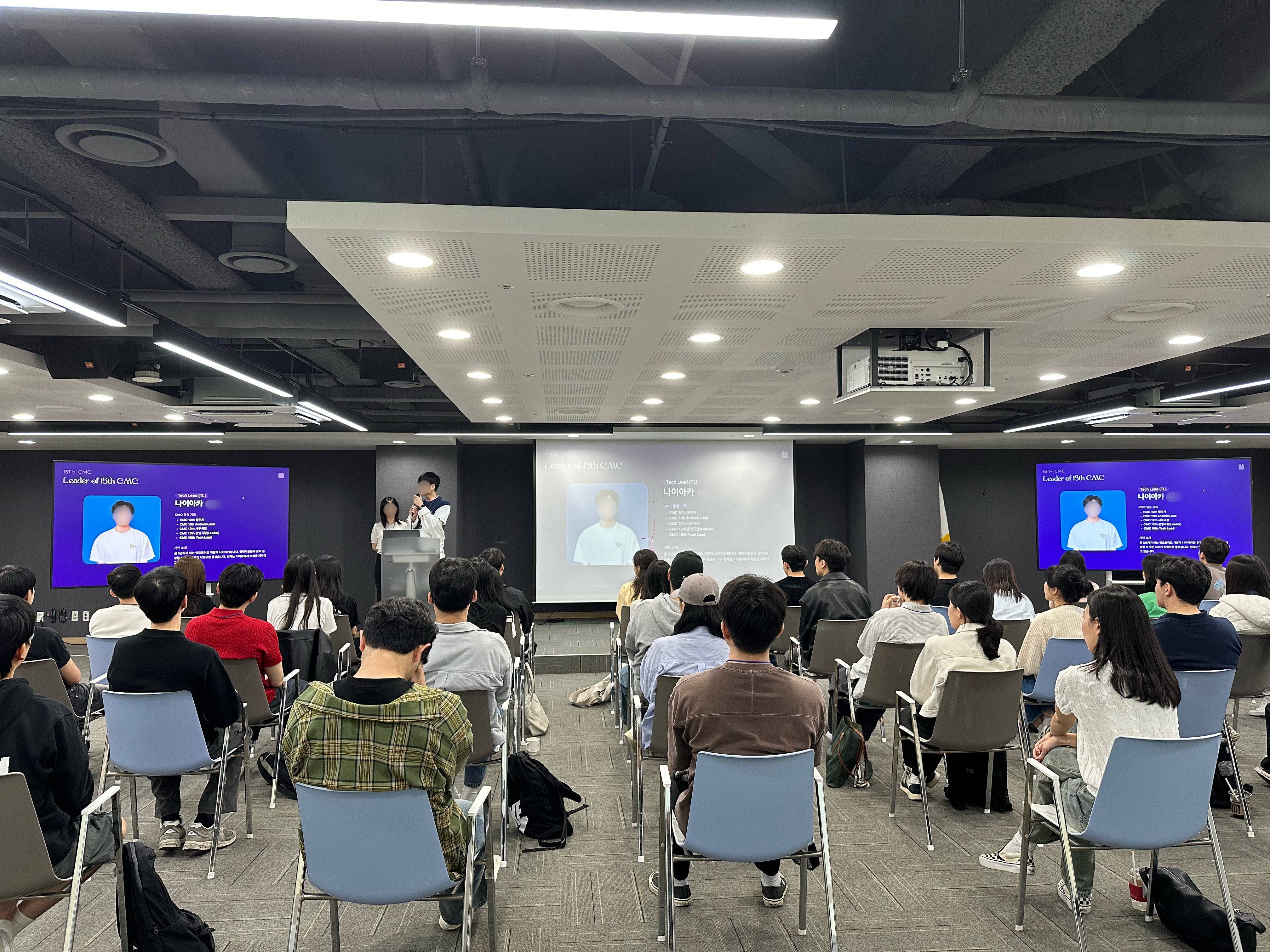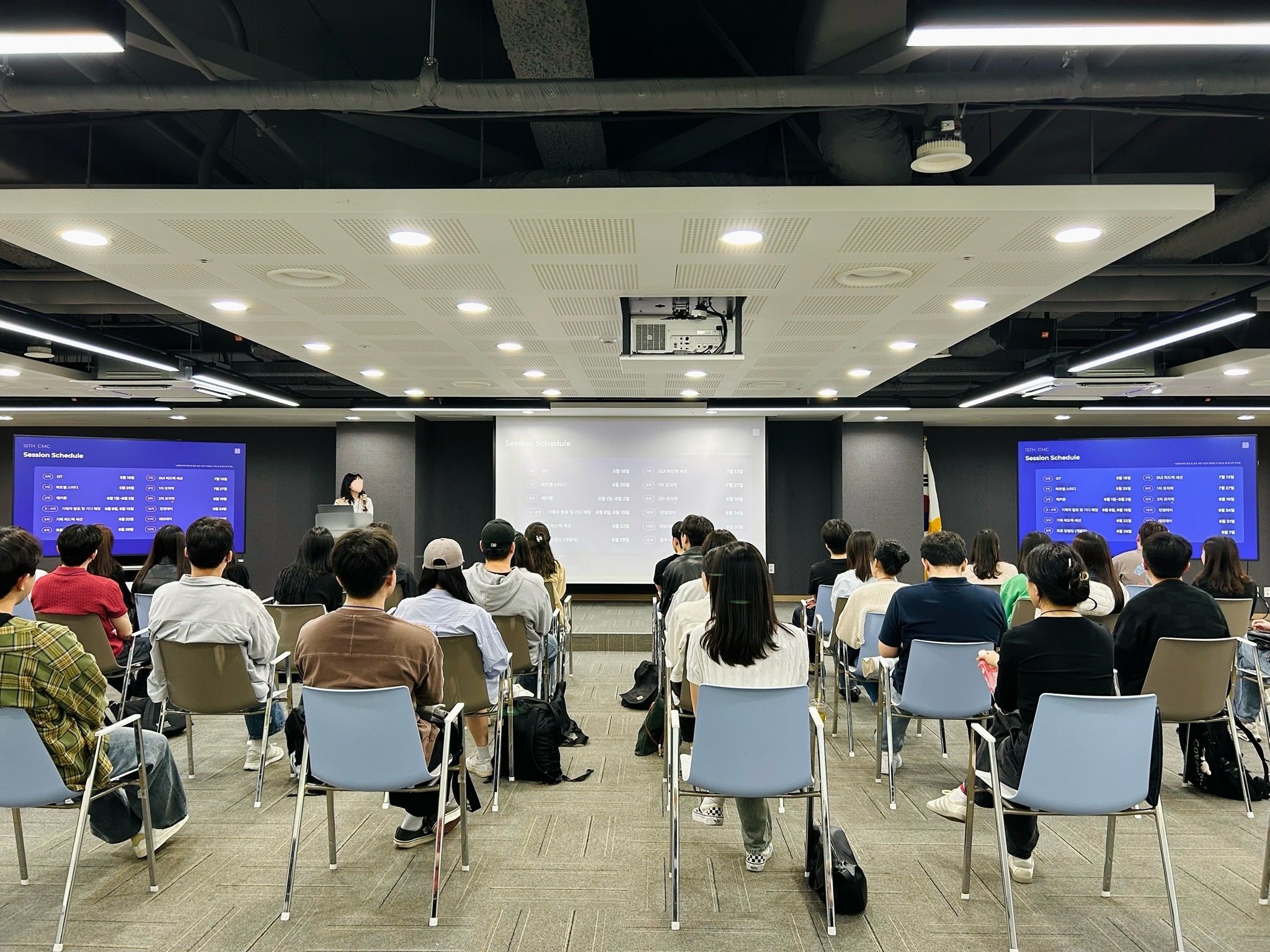 OT 진행중의 사진을 하나 가져왔는데요. 이번 CMC의 운영 방식 및 일정에 대한 소개를 하고 있습니다. 확실히 온라인으로 진행하던 OT때는 생각보다 많은 사람들이 OT에서 하는 말들을 다른 일들을 병행하며 들어 집중력이 생각보다 떨어진다고 생각했는데, 눈으로 보면서 직접 대화를 나누니 확실히 많은 사람들이 OT 세션에 집중해주는 것을 느꼈습니다.