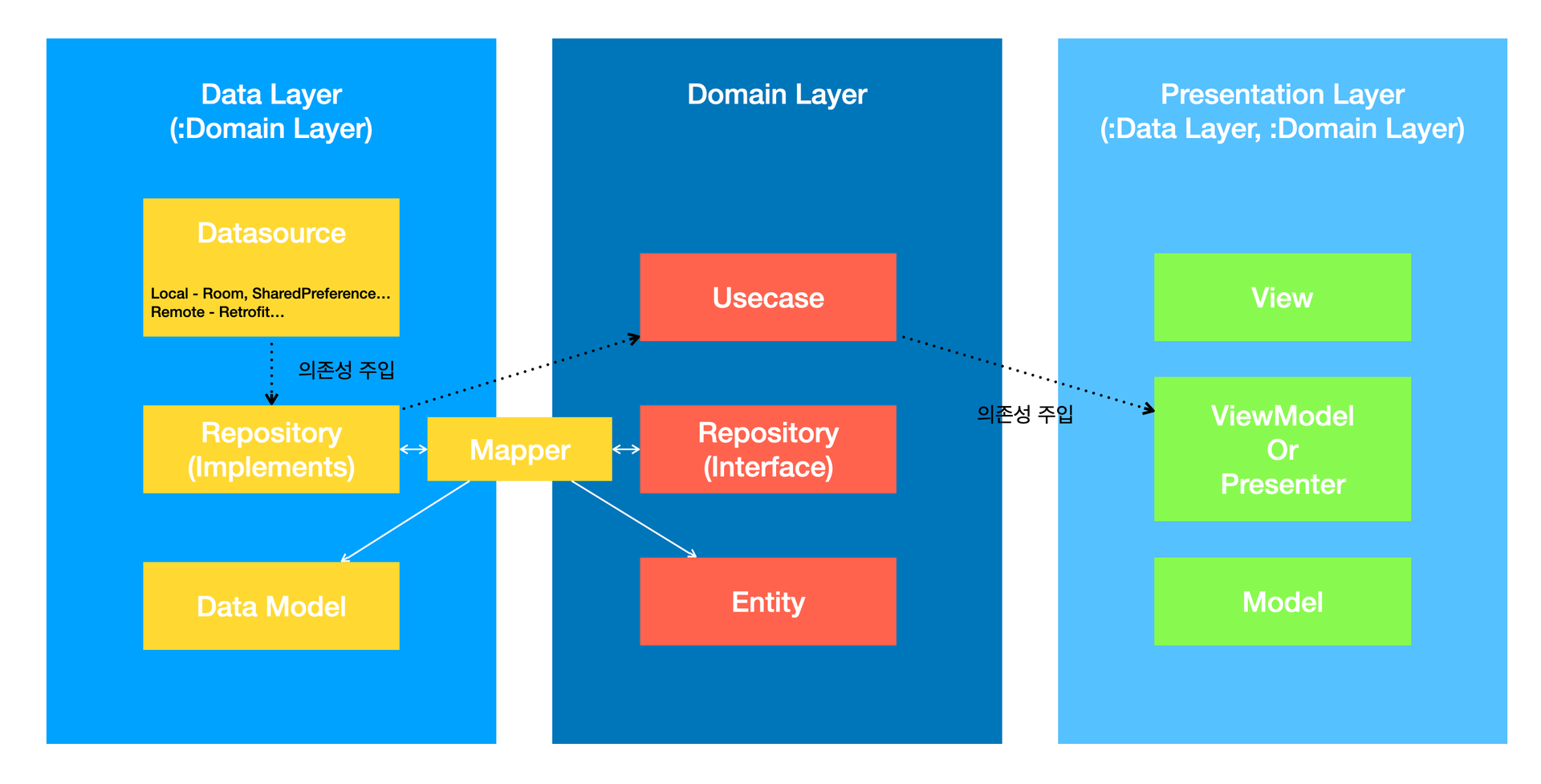 그리고 위 표에서는 Domain Layer와 Data Layer 모두를 참조하고 있지만, 저는 개인적으로 Domain Layer만 참조하여 사용합니다. 아무대로 Presentation Layer에서 직접적으로 Data Layer를 참조할 일을 없게 개발을 진행하고 있기 때문에, 아예 Data Layer와 Presentation Layer의 의존성을 분리시켜 Domain을 통해 작업하도록 코드를 진행합니다.