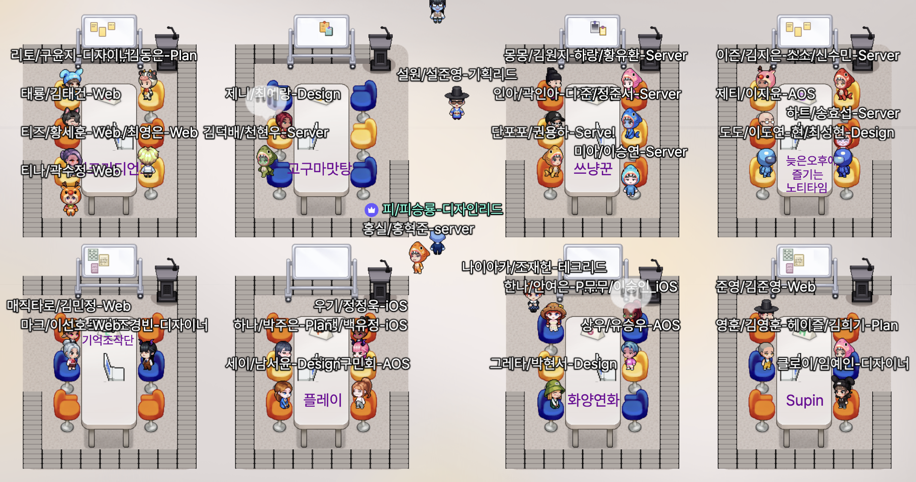 이제 리더진들도 사라지고 난 후, 정말 사람들이 자유롭게 돌아다니며 마지막 어필 혹은 같이 의사결정을 할 사람들끼리 모여 논의하는 것을 보고 있었습니다. 클라이언트 팀은 2명씩 짝을 지어 조용한 위치에서 대화했고, 서버는 단체로 모이거나 소소하게 모여 이곳저곳 돌아다니더라구요.