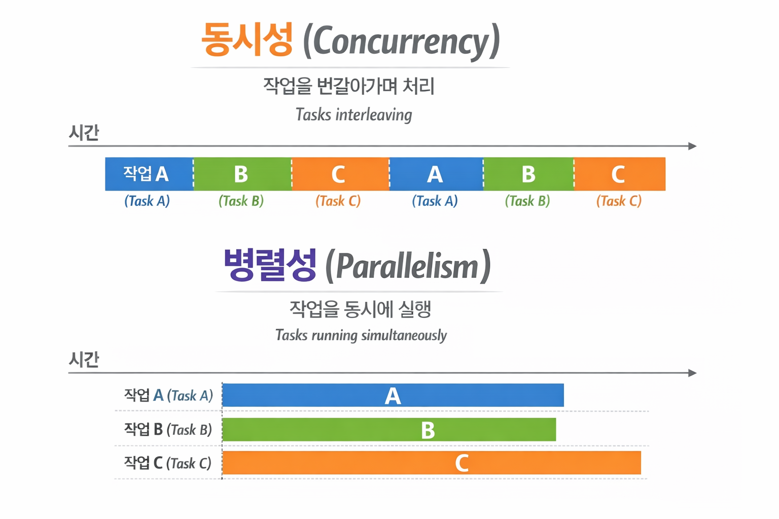 위 그림은 동시성과 병렬성에 대해 표현한 것입니다(ChatGPT에게 그려달라고 했는데 괜찮은 것 같습니다). 동시성이란 위 사진처럼 실제로는 작업이 매우 빠른 속도로 스위칭되며 반복되고 있지만, 이를 사람이 인지하지 못할 정도로 빠르게 반복해 동시에 보이게 하는 개념입니다. 반면에 병렬성은 실제로 여러개의 작업이 동시에 실행되는 것을 의미합니다. 물리적으로 여러개의 코어를 가지고 각각의 코어가 하나씩 작업을 맡아 동시에 코어의 개수만큼 일을 병렬적으로 진행할 수 있습니다.