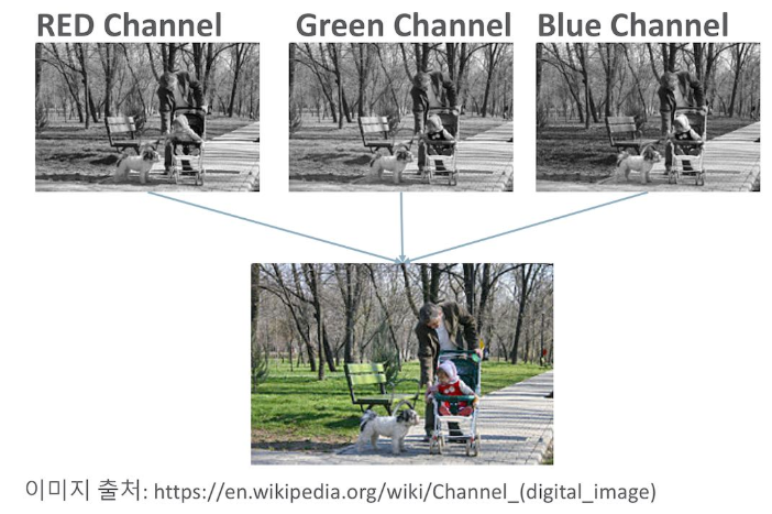이미지의 데이터를 예로 살펴봅시다. 컴퓨터에서 이미지는 크게 R, G, B의 값으로 이루어져 있고 세 가지의 채널이 합쳐져서 하나의 이미지가 됩니다. 아래의 그림과 같이 말이죠.
