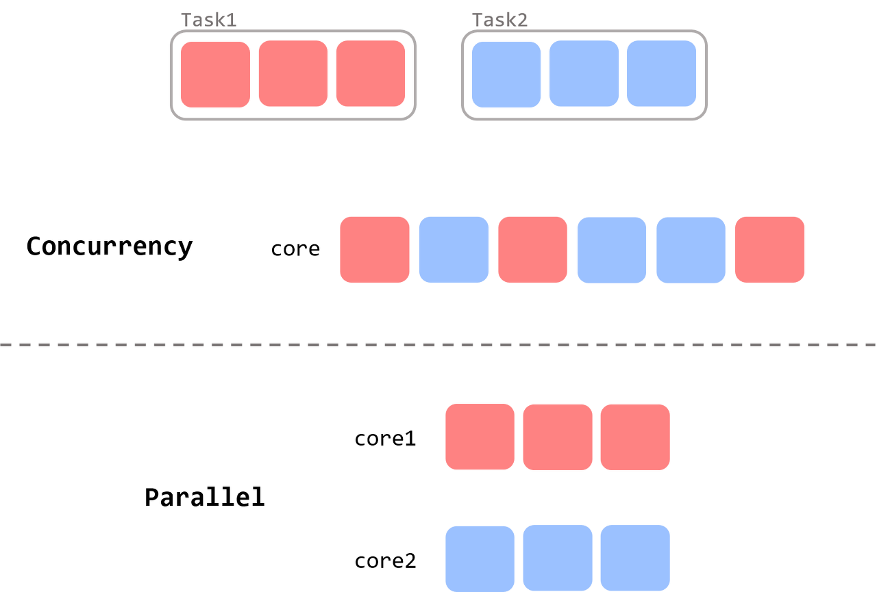 위의 사진에서 concurrency(동시성)이 하나의 코어에서 2개의 스레드가 동작하는 방식이고, parallel(병렬성)이 2개의 코어에서 2개의 스레드가 동작하는 방식을 표현하는 것입니다.