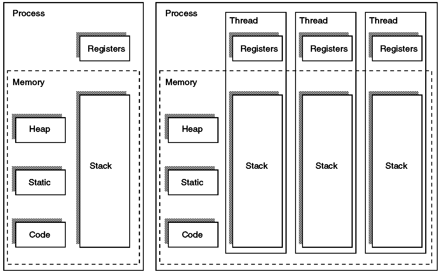 스레드는 프로세스의 자원을 공유하며 프로세스 내부에서 처리해야 할 작업들을 스택과 레지스터를 이용해 처리해주는 유닛을 의미합니다. 이러한 스레드를 가진 프로세스는 미리 개발자가 만들어둔 '프로그램'을 메모리 상에 올려 실행중인 것을 의미합니다.