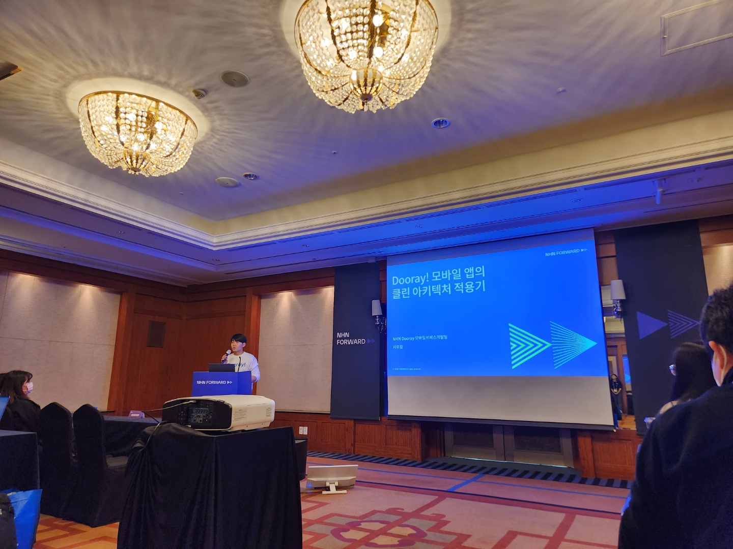 선착순 1200명에게 점심권과 함께 웰컴 키트가 제공되어 저는 10시 행사지만 출입 가능한 9시에 도착해 여유롭게 줄서서 등록과 키트 등을 수령하고 각 트랙을 살펴보고 있었습니다. 저는 아무래도 안드로이드 개발자이면서 회사에서 IOS도 간간히 작업하는 개발자이다보니 가장 관심이 갔던 건 오후에 있는 Dooray 모바일 클린아키텍쳐 도입기와 ReactorKit을 이용한 MVI 적용 과정 세션이었습니다. 오전에는 딱히 모바일 관련 세션이 없었던 관계로, 오전에는 예전부터 관심이 있던 마이크로 서비스에 대해 이야기하는 거대한 서비스 쪼개서 마이크로 프론트엔드 만들기 세션에 참가하기로 생각하고 맞는 트랙에 입장해 keyNote를 듣게 되었습니다.